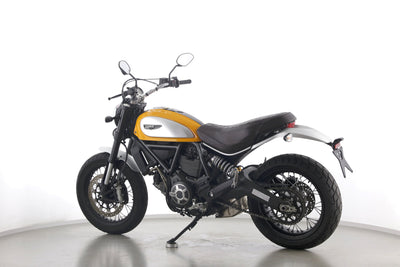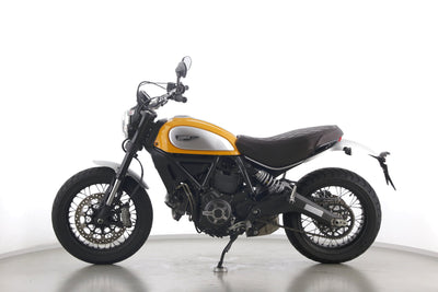 Eine Ducati Scrambler Classic aus zweiter Hand in gepflegtem Zustand u.a. mit neuen Zahnriemen sowie brauner Classic-Sitzbank.