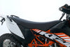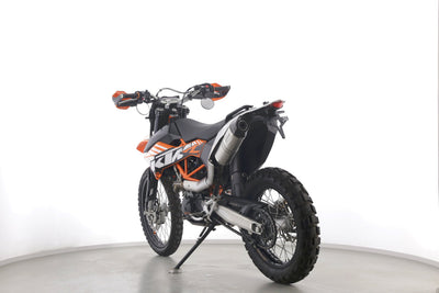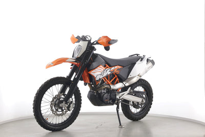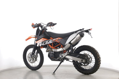 Eine KTM 690 Enduro R in gebrauchtem Zustand u.a. mit LeoVince-Endschalldämpfer sowie kurzem Kennzeichenhalter.