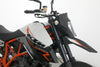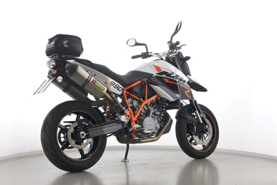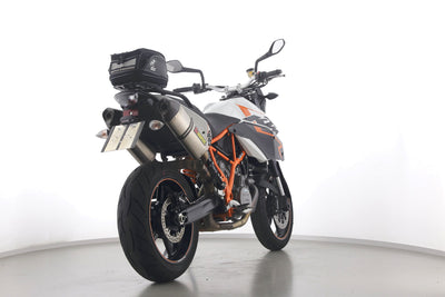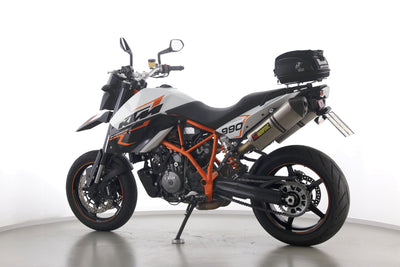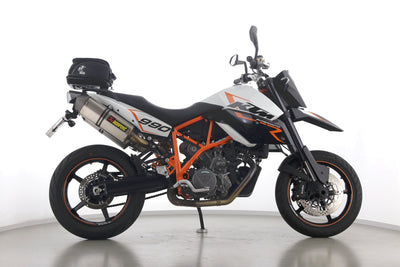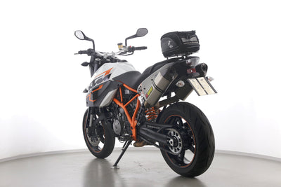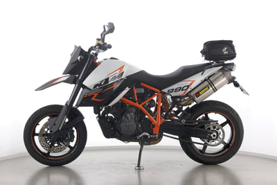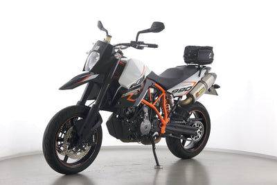 Eine KTM 990 Supermoto aus zweiter Hand in sehr gepflegtem Zustand u.a. mit Akrapovic-Endschalldämpfer sowie Hepco&Becker Gepäcktasche.