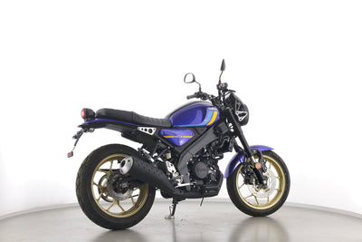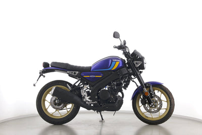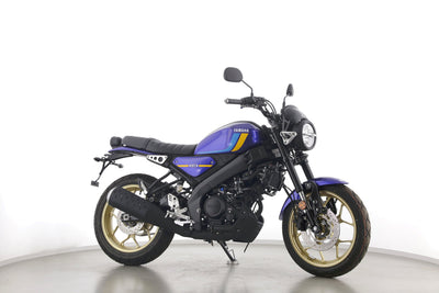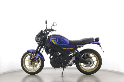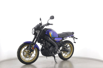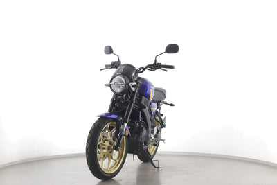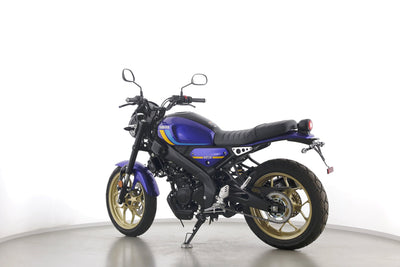 Eine Yamaha XSR 125 als Neufahrzeug u.a. mit gefrästen Brems- und Kupplungshebeln und kurzem Kennzeichenhalter.