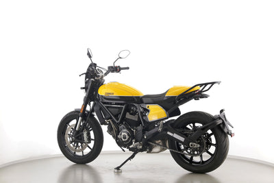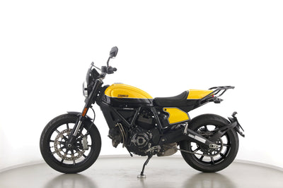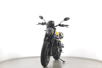 Eine Ducati Scrambler Full Throttle in gepflegtem Zustand u.a. mit Gepäckträger und Windschild.