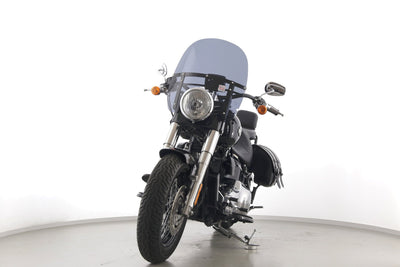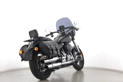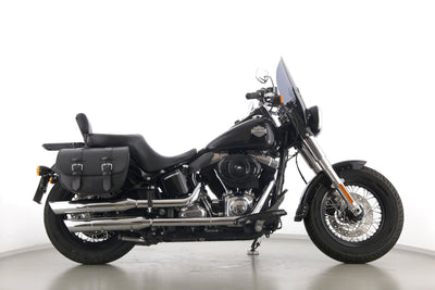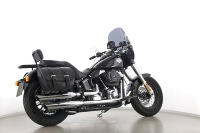 Eine scheckheftgepflegte Harley-Davidson Softail Slim FLS 103 aus zweiter Hand in sehr gepflegtem Zustand u.a. mit HD-Lederkoffern und Touring-Scheibe.
