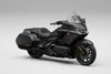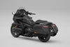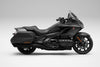 Die 2025er GL1800 Gold Wing mit DCT­Doppelkupplungsgetriebe als '50th Anniversary Edition' schmückt die dezente Farbe „Matt Ballistic Black“, dazu zieren geschmackvoll angedeutete Gold­Wing­Logos die integrierten Seitenkoffer rechts und links.