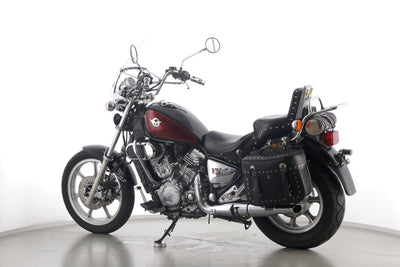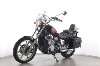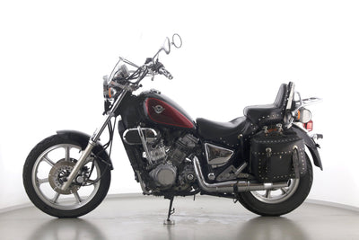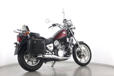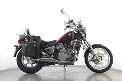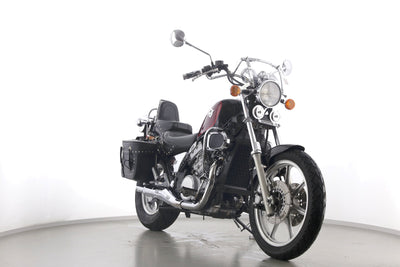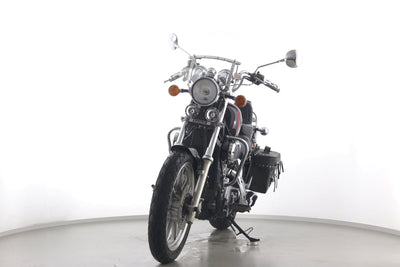 Eine Kawasaki VN 750 in gebrauchtem Zustand u.a. mit Windschild und Sturzbügel.