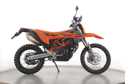 Eine KTM 690 Enduro R aus erster Hand in gebrauchtem Zustand mit Sturzbügel und LED-Blinkern.