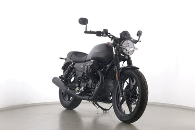 Eine Moto Guzzi V7 Stone als Neufahrzeug u.a. mit Mistral-Endschalldämpfer und Lenkerendenspiegeln.